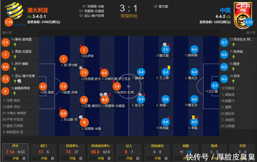 由于国足又丢了3球,王大雷评分也当然是全队最低的,仅为6.1。王大雷顶替颜骏凌之后,其实他的弘扬并莫得比颜骏凌出色。18强赛首场对阵日本,敌手8次射正进了7球。这场比赛,澳大利亚4脚射正进了3球。真念念问问伊万,门将位置就不可换一个年青点的,响应更快的吗?