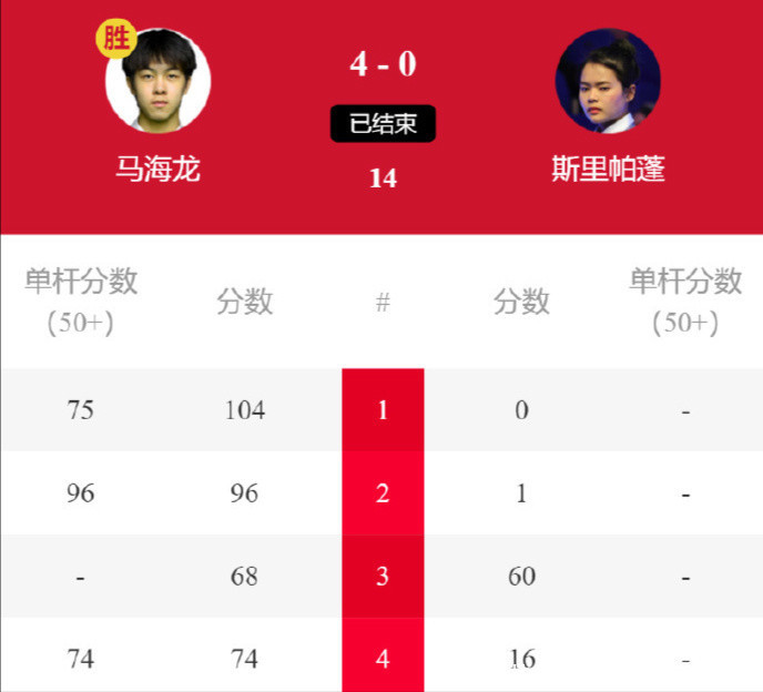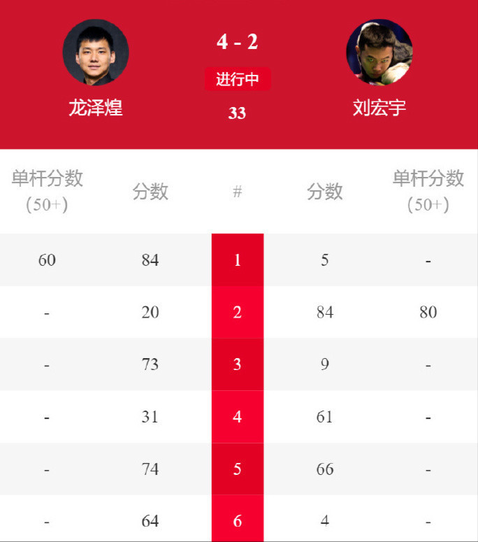 而在96进64轮次的争夺中,共有2场中国德比战,龙泽煌VS刘宏宇、吕昊天VS王雨晨。经由热烈争夺,刚刚在武汉公开赛打进4强的龙泽煌以4-2驯顺刘宏宇、名将吕昊天以4-3险胜中国香港选手 王雨晨。