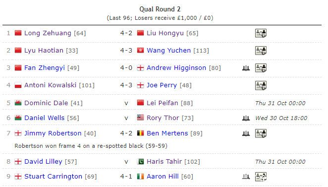 今天凌晨适度的几场比赛中,上赛季最好少壮国强以4-0轻取路易-希斯科特、徐想以4-1驯顺安德鲁-帕吉特、欧洲行家赛冠军范争一以4-0轻取宿将安德鲁-希金森、黄佳浩以2-4不敌名将里奇-沃顿。另外,61岁的6届世锦赛亚军“无冕之王”吉米-怀特以4-1轻取哈特姆-亚辛。
